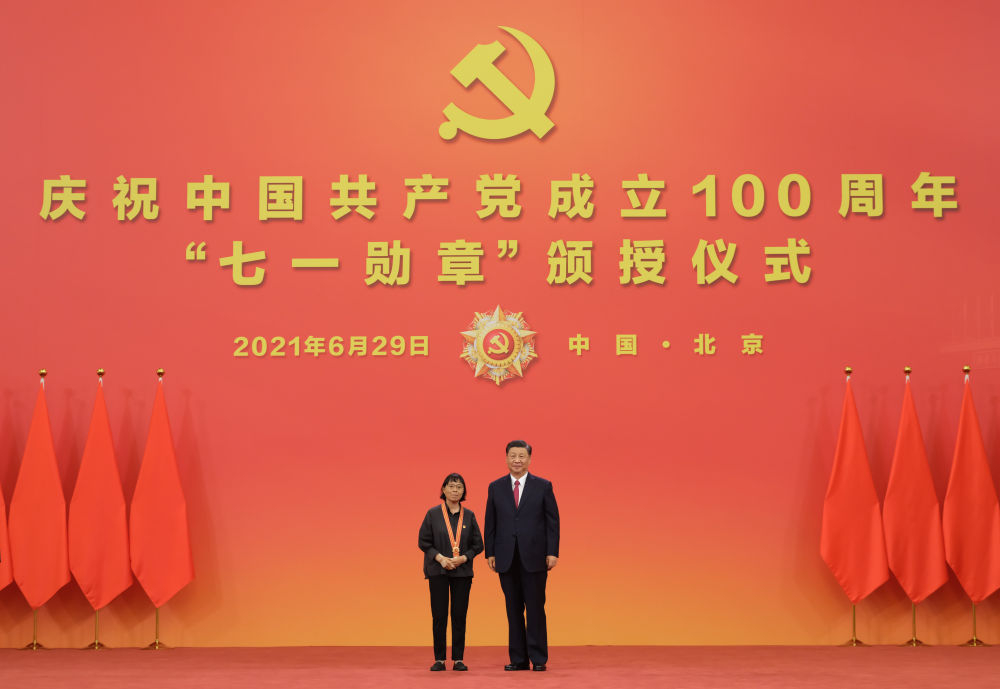 2021年6月29日,习近平总书记向“七一勋章”获得者张桂梅颁授勋章。新华社记者 李学仁 摄