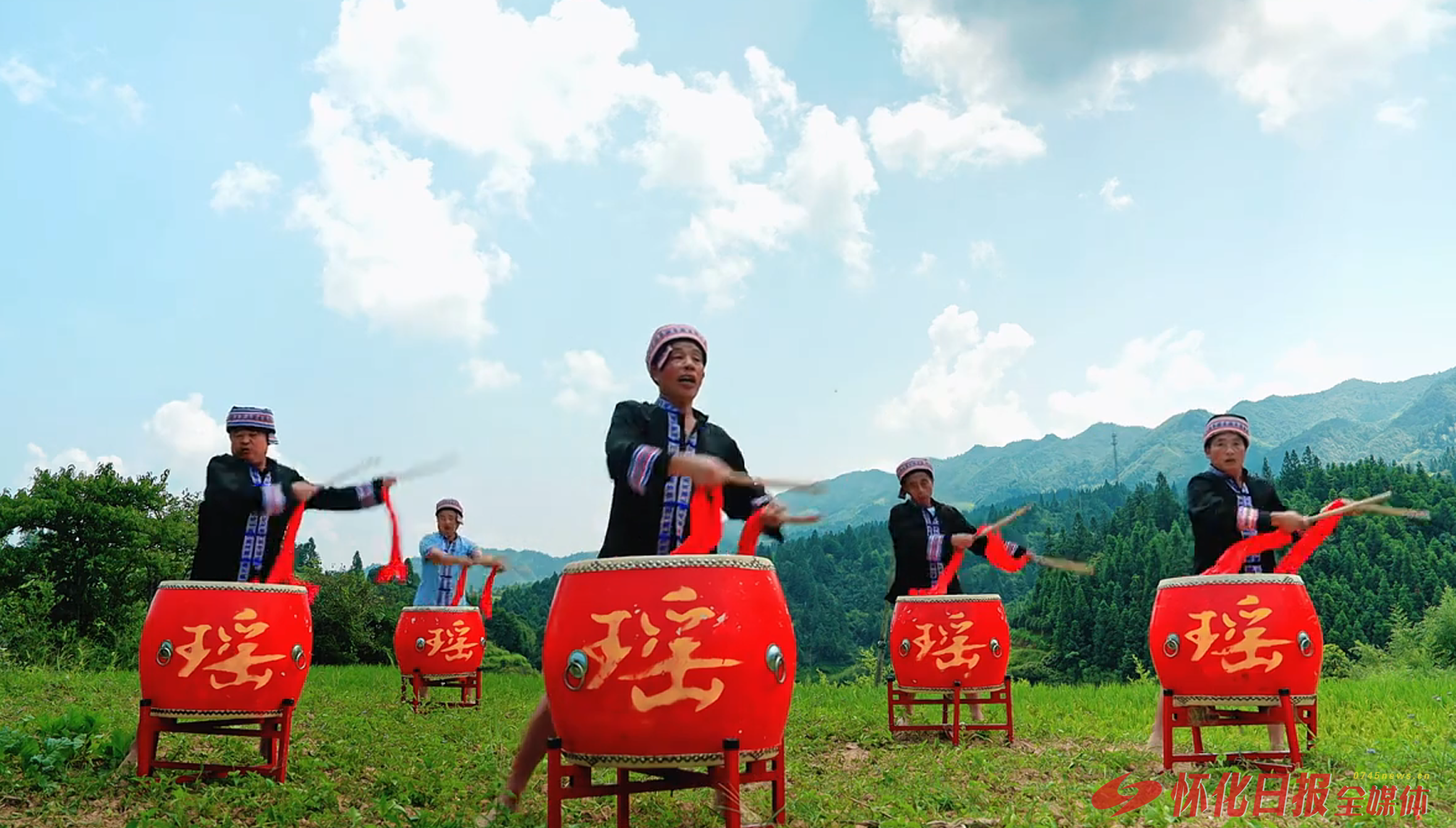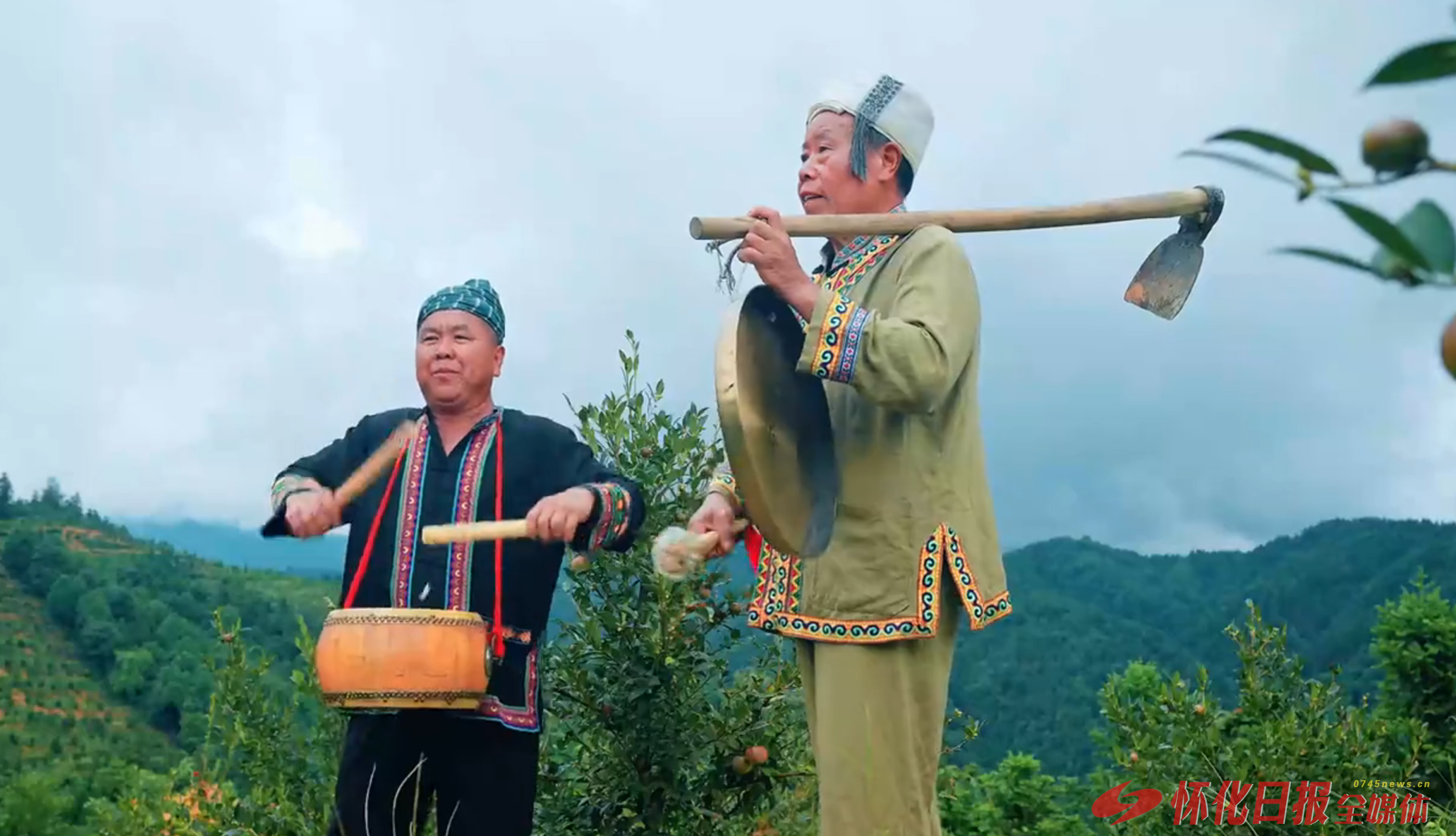 (图为怀化群众在自然环境中用鼓、锣等乐器,将艺术与劳作紧密结合。)