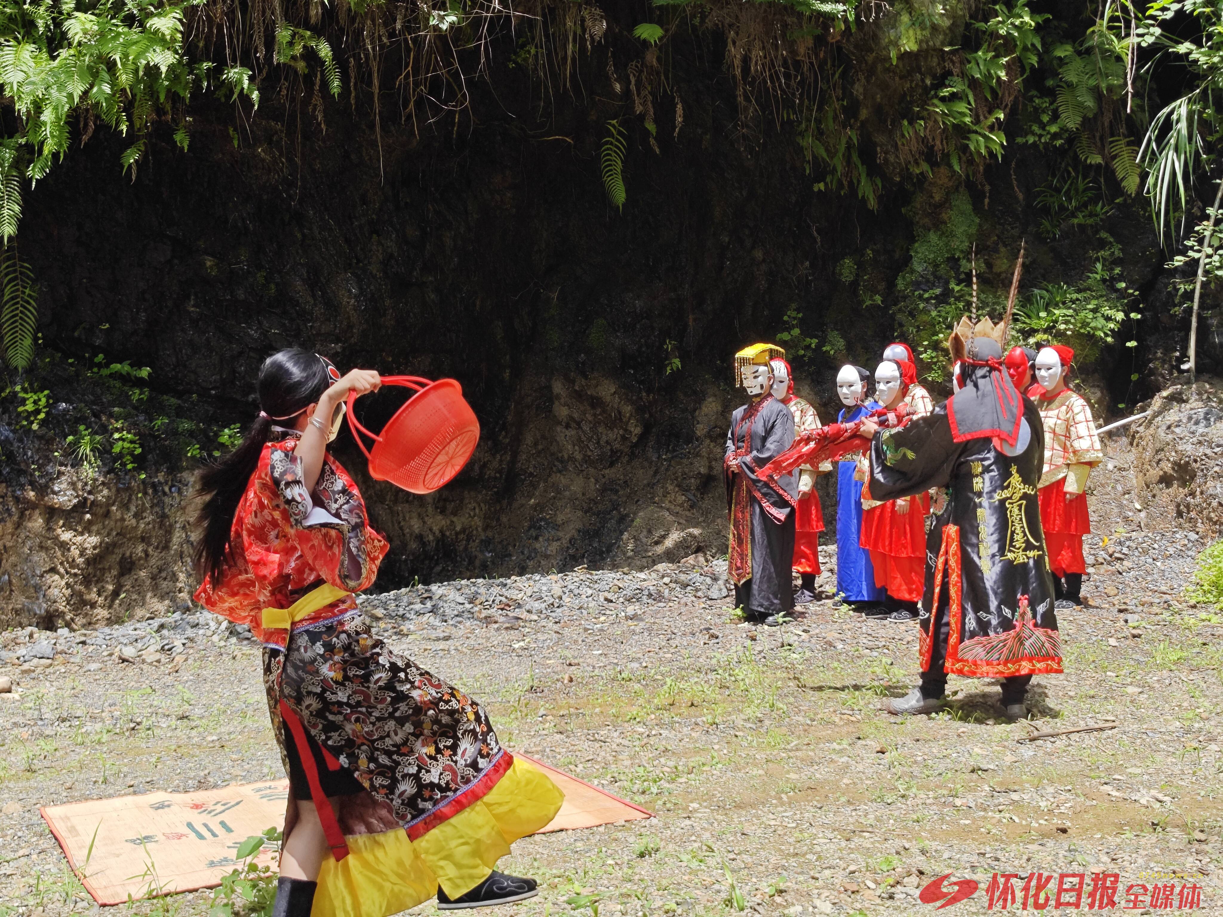 (图为屈原行吟地明月洞,当地群众正在演绎《山鬼》巫傩戏片段)