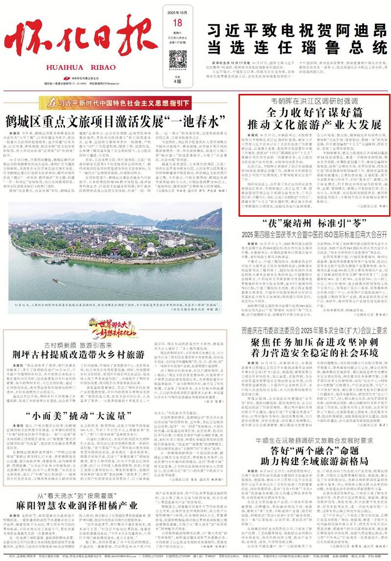 怀化日报全媒体讯10月17日,市委副书记、市政府党组书记韦朝晖在洪江区调研时强调,要深入学习贯彻习近平总书记关于文化和旅游工作的重要论述,认真落实省委、省政府决策部署和市委工作要求,把抓好“十四五”圆满收官和“十五五”谋篇布局作为当前的一项重要任务,全力推动文化旅游产业大发展。市领导向汝莲参加。