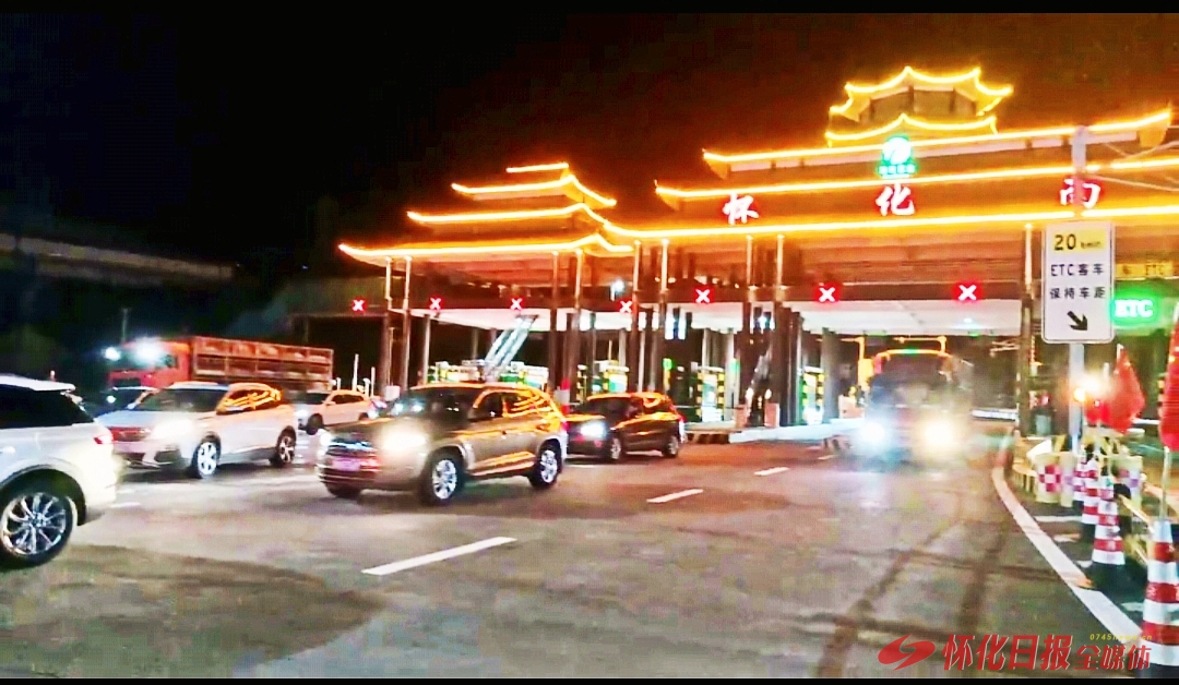 (10月3日晚,怀化南收费站迎来车流量高峰。 怀化日报全媒体记者 张卓 通讯员 粟翠财 摄)