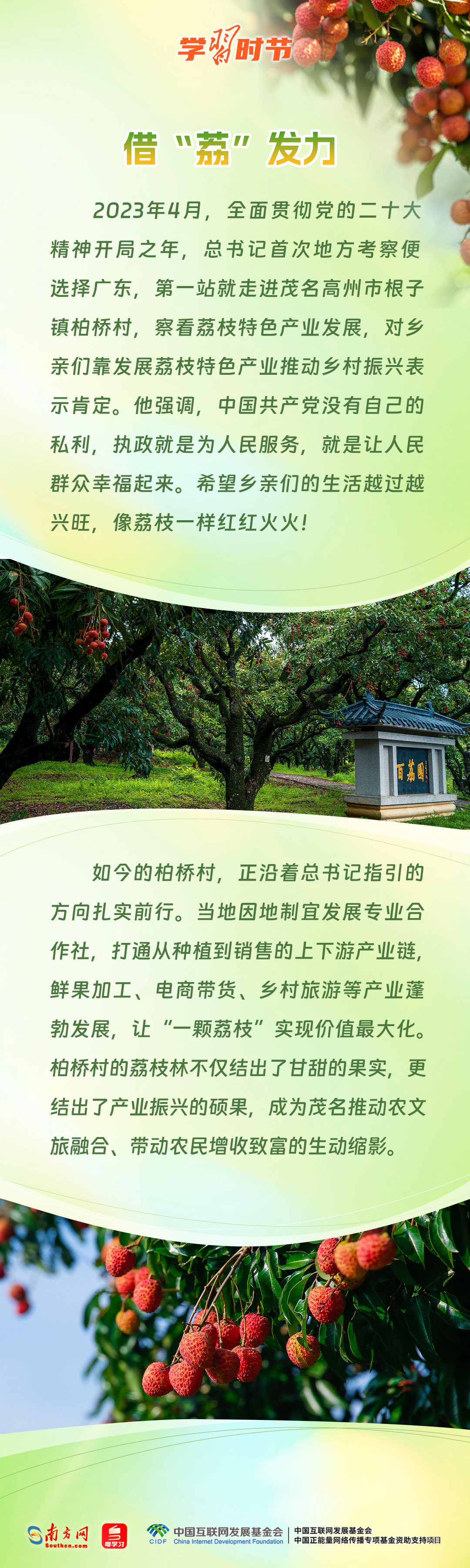 党的二十大后,习近平总书记两次考察广东,分别走进粤西、粤北的乡村田间。在茂名柏桥村的古荔树下、梅州南福村的金柚基地里,总书记亲切问询特色产业发展情况,饱含对乡村振兴的殷切期盼,也传递着对农民增收致富的甜美祝愿。
